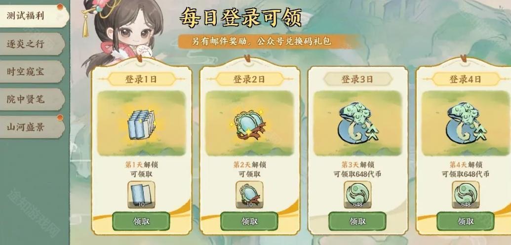 1、每日登录奖励:测试期间每日登录,活动界面领拜帖、窥宝镜、绘玉等,助力抽取名士、文物,提升养成进度。