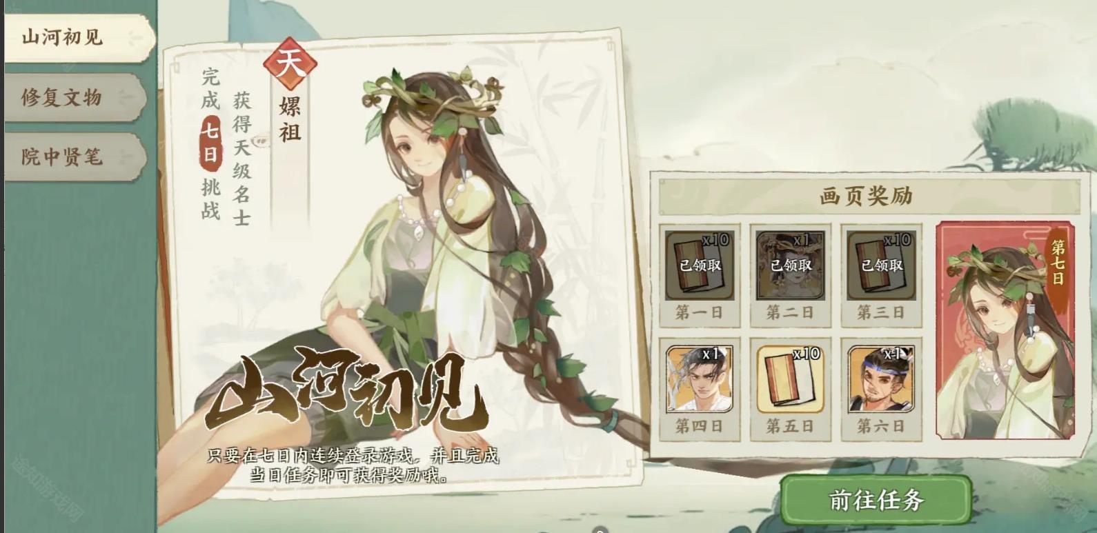 2、任务解锁福利:每日完成活动任务,得元宝、名士/文物升级材料;累计完成2/4/6日任务,领地级名士,7日任务送天级名士嫘祖。