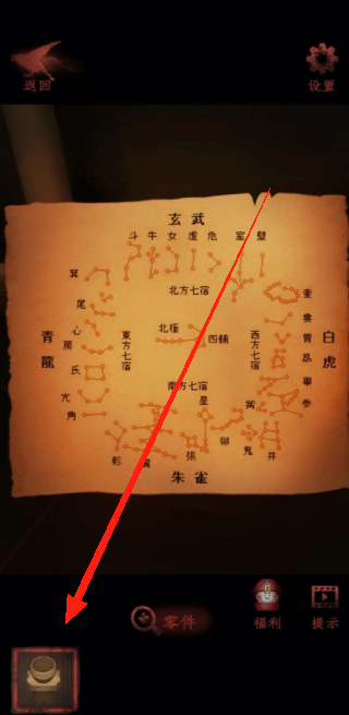 1、棋子获取:在男纸人右脚处拾取天字棋子,点击女纸人掉落齐字棋子,将两枚棋子镶入左边墙暗格凹槽。