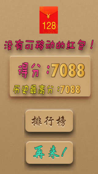 3、结算界面,若“没有可移动的红包”,点击【再来!】,重新开局,挑战历史最高分(7088)。