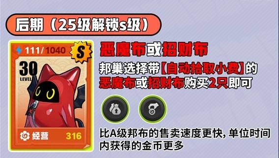 2、后期(25级解锁S级),选【恶魔布/招财布】,邦巢挑带【自动拾取小费】的,购买2只,其售卖速度比A级邦布快,单位时间金币收益更高。
