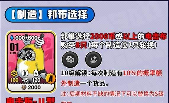 2、制造主力(中期):选择A阶「电击布-小型」(邦巢2000币档),采购8只(每制造位2只轮换),10级解锁10%概率额外制造,提升货品产出效率。