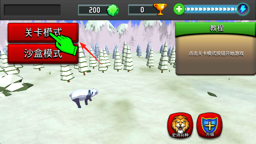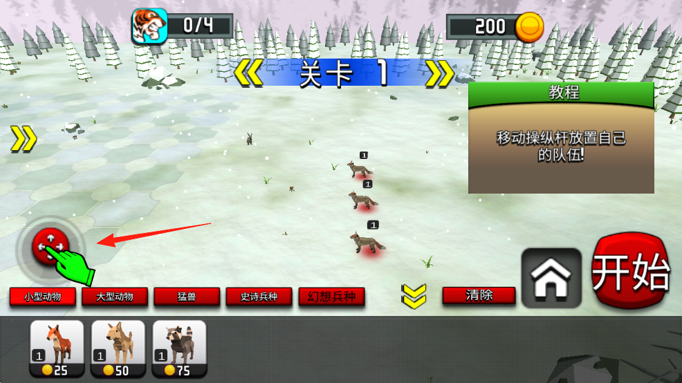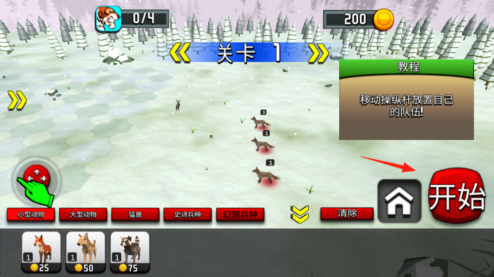 1、选“关卡模式”,进入关卡1,查看敌方(狼)布局,在兵种栏选动物(狐狸狼),点击布置。