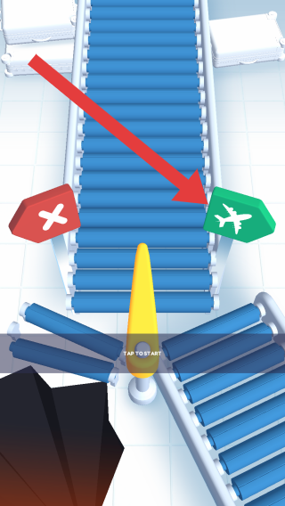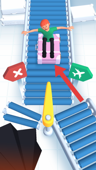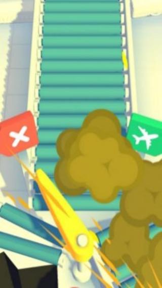 1、呈现传送带分拣场景,需引导物品流向正确通道(绿色飞机标识代表航空相关,红色叉号为错误通道),玩家通过操作让物品匹配对应标识通道,完成分类分拣任务。
