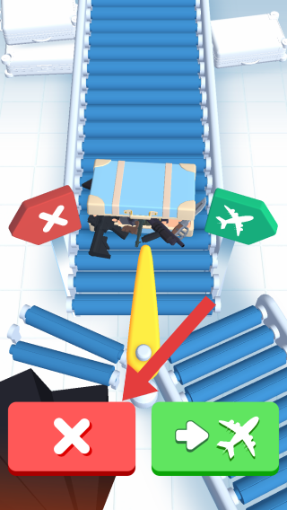 2、呈现行李安检分拣场景,行李箱内有违禁品(枪支),需通过操作(黄色指针引导)将其导向红色“×”通道(代表拦截违禁品),绿色通道为正常托运,玩家要识别物品合规性。