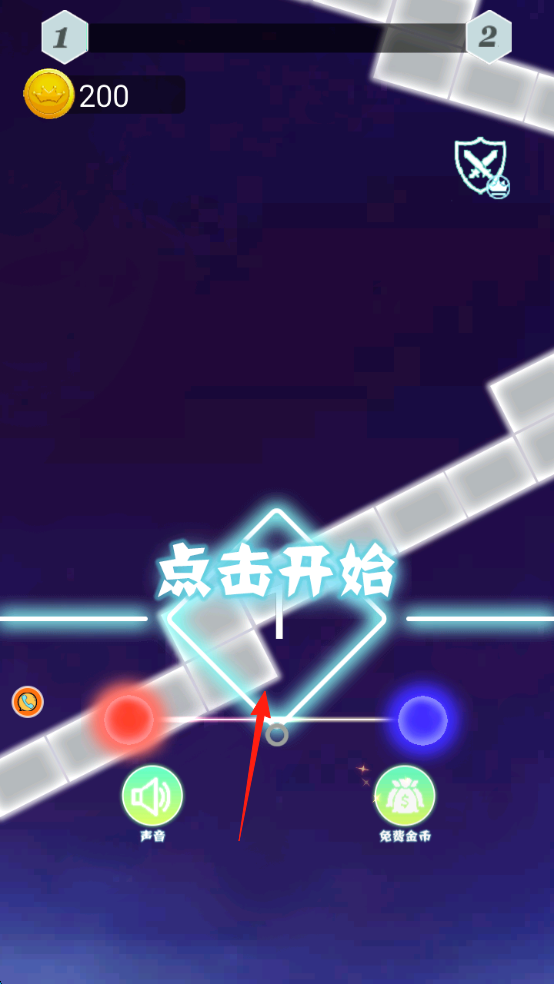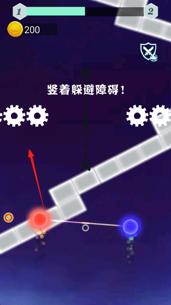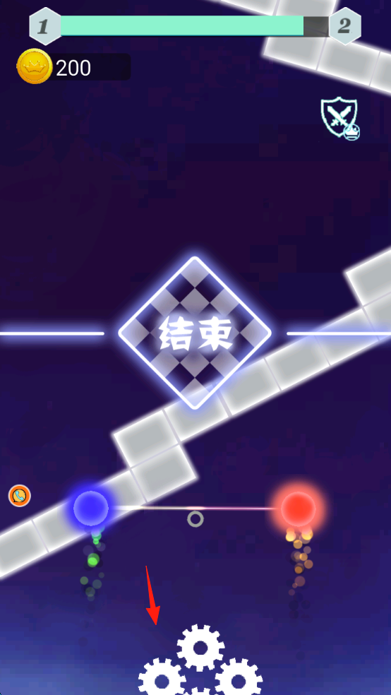 3、冲刺至终点(“结束”标识),途中留意新障碍(底部齿轮),灵活操控双球,完成关卡,积累金币(200)。