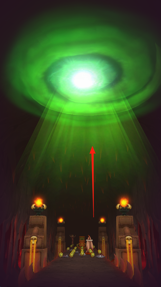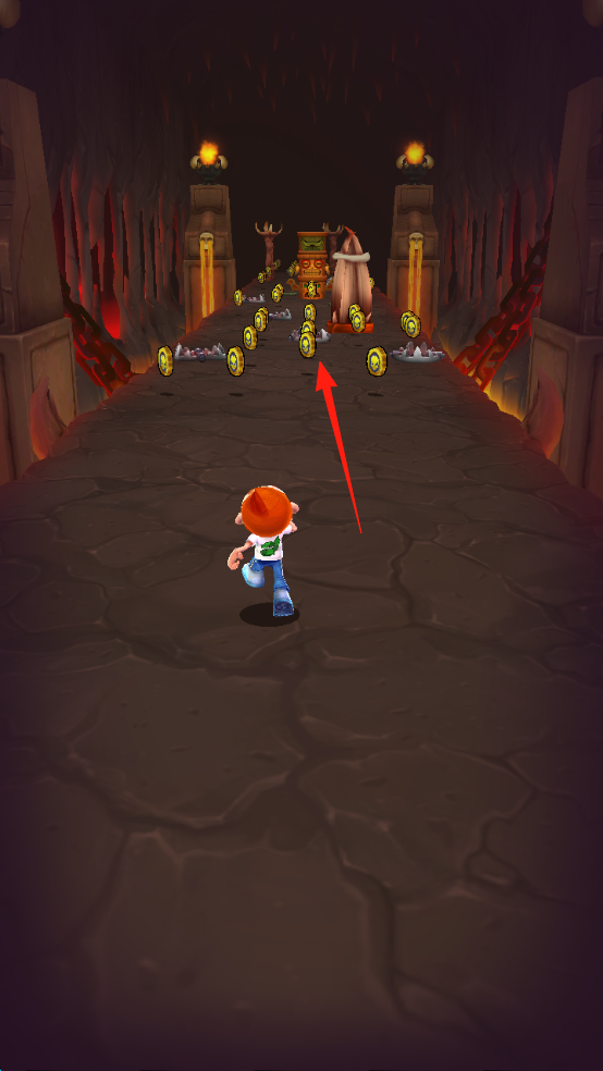 2、操控男孩,沿箭头跑酷,拾取金币,跨越障碍(陷阱沟壑),接近关卡目标(巨型雕像)。