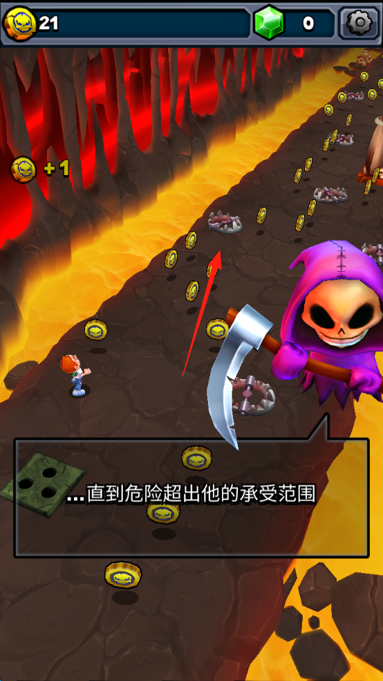 3、遭遇死神怪物,加速躲避(绕开镰刀范围),收集金币提升分数,坚持到危险临界,完成逃亡。
