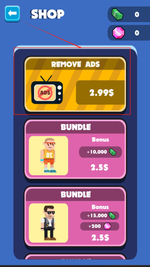 1、在商店界面选中红框标记的"REMOVE ADS"选项,花费2.99美元移除广告,或选择下方2.5美元的BUNDLE礼包获取10000绿宝石奖励。