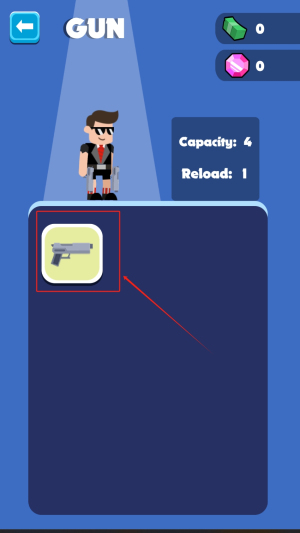2、进入武器界面查看红框选中的手枪属性,注意容量4发子弹和装填时间1秒的设置,根据战斗需求调整装备。