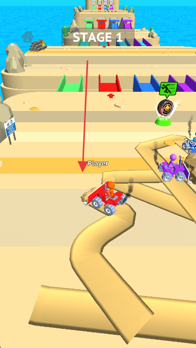 2、在Stage1的沙地赛道,操控红色推土机(Player),与紫色对手竞速,沿弯道行驶。