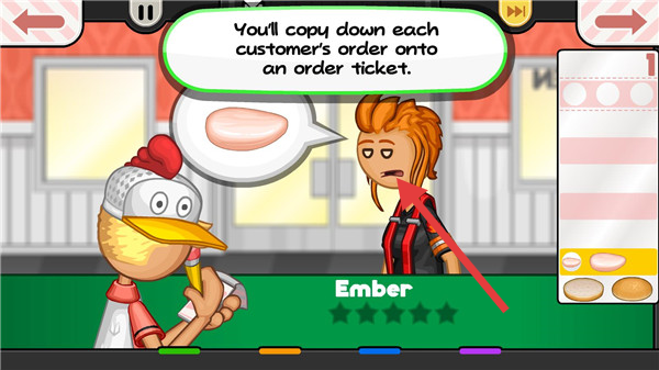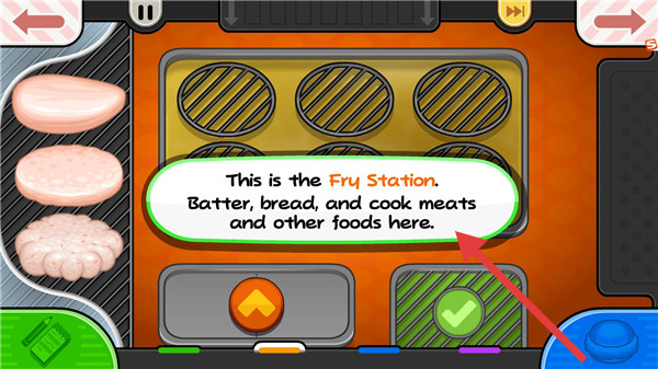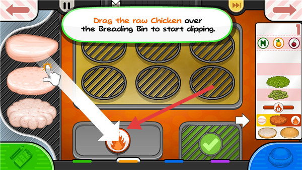 3、接收订单,记在票据,前往油炸区,按提示拖鸡肉裹糠,启动制作。