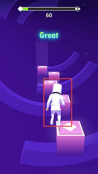 2、操控小人沿方块路径奔跑,根据音乐节奏点击屏幕跳跃,精准踩中每个节奏节点避免踩空。