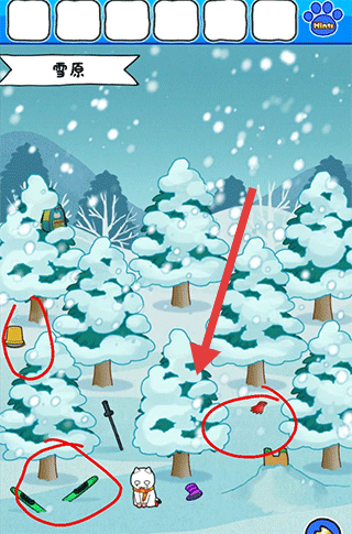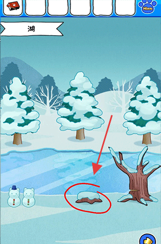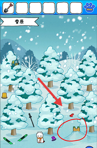 2、利用“铲子”铲开旁边的雪堆,解救猫老大,而猫老大则会将【洞窟前】的雪人推开,解锁新地图。