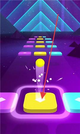 1、进入关卡,小球随音乐节奏前行,点击屏幕让其跳跃到对应颜色瓷砖(黄、紫、蓝等)。