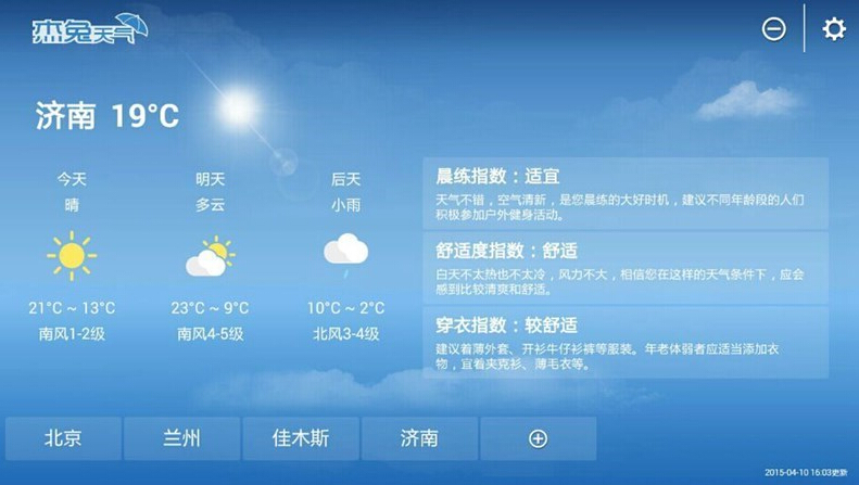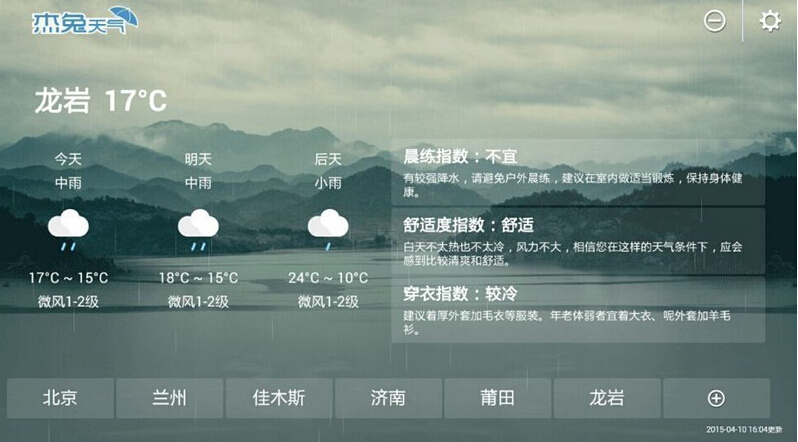 杰兔天气是一款智能电视天气播报应用。用户可以使用本软件查询一周内的天气状况,包括气温、紫外线、雾霾等信息提示。并且具备开机天气提醒功能,让你一手掌握当天的天气状况,出门更放心!欢迎用户下载使用。