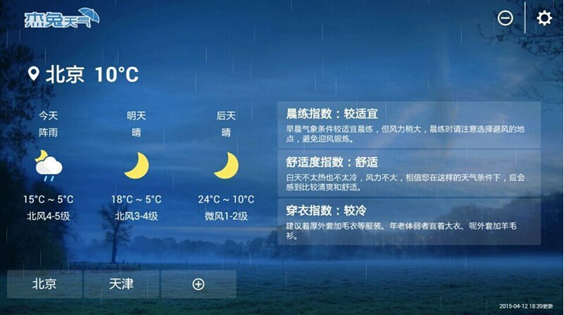 2.自取启提醒:杰兔天气实时汇报,还在纠结。穿不穿秋裤,洗不洗车?