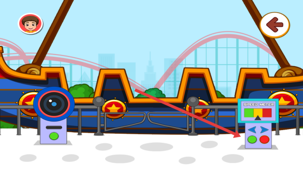 3、操作游乐设施(如海盗船)时,按箭头指引点击控制台按钮,启动设备,体验主题公园娱乐项目。