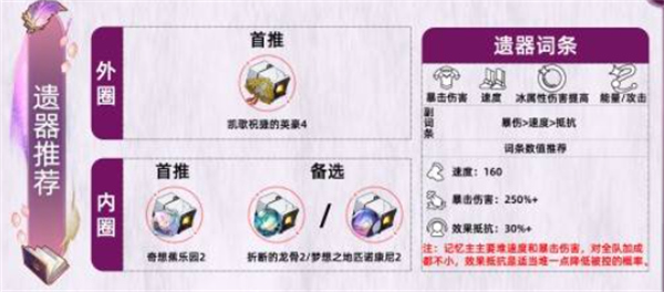 3、遗器选择「凯歌祝捷的英豪」四件套,提供12%速度与15%暴击伤害,副词条优先级:速度>暴击伤害>能量充能效率。