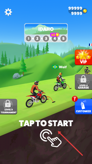 1、点【TAP TO START】,选红色摩托(Idaho场景),用99999金币,开始LEVEL1。