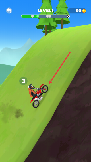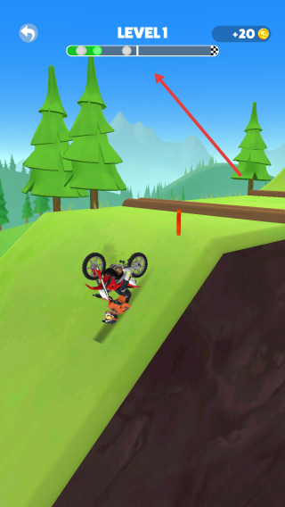 2、遇陡坡,控摩托(平衡/油门),避坠落,攒“+20”“+50”金币,续跑。