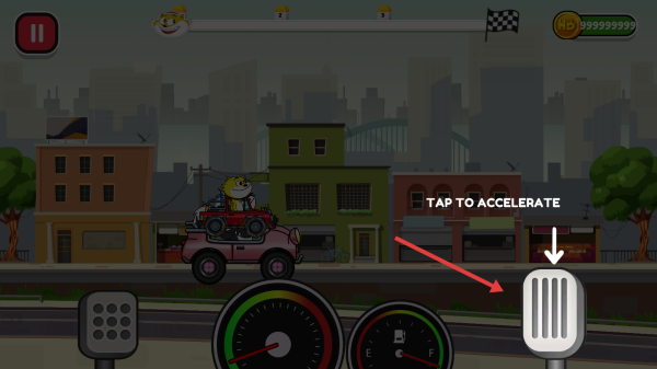 2、点右侧加速键(TAP TO ACCELERATE),控粉色赛车,冲起步,超对手(黑白色角色)。