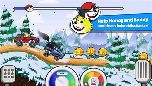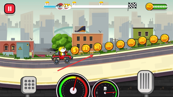 3、沿赛道,吃金币($/25/50),稳控赛车,避障碍,保第一,赢奖励,升赛车性能。