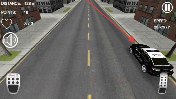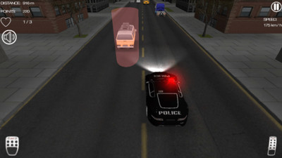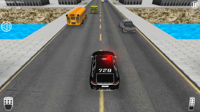 3、通过左侧方向按钮控制警车转向,右侧速度按钮调节车速,在道路上行驶积累分数,留意距离,完成驾驶任务。