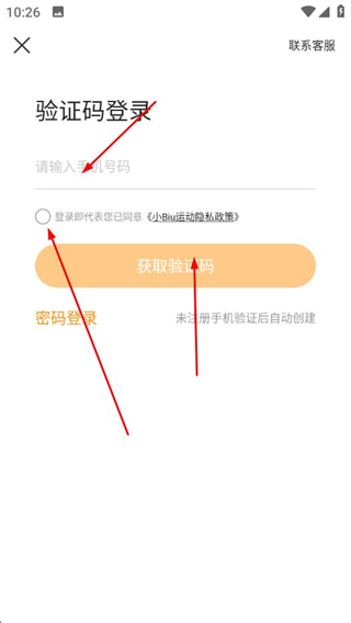 1、打开小Biu运动APP,输入手机号码,勾选隐私政策,点击获取验证码。