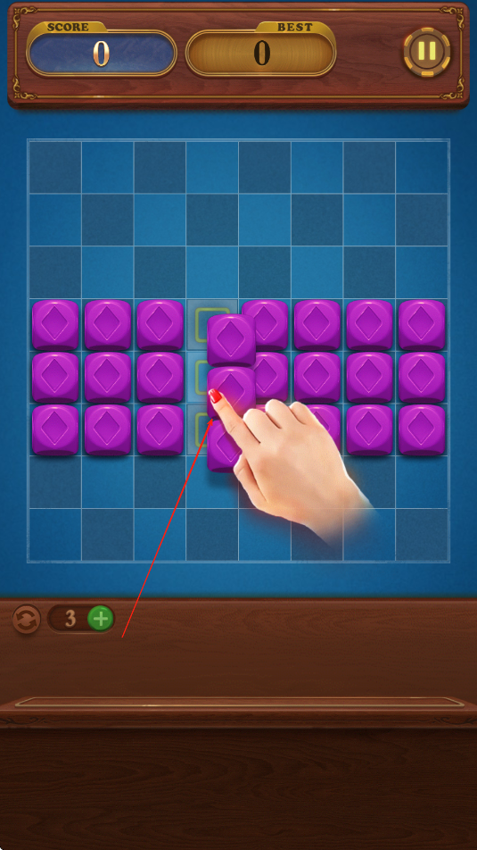 1、进入游戏后观察传送带上方块形状,轻点屏幕拖动方块至8x8棋盘,当横纵方向形成完整直线时触发消除,注意预留空间避免棋盘填满,轻松开启消除挑战。