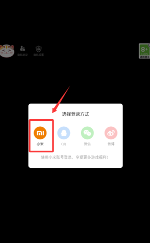 1、选择小米账号登录方式,点击红框标注的MI图标进入。