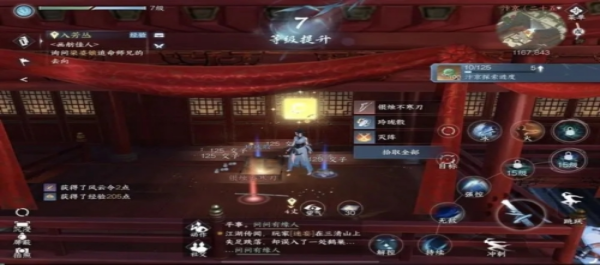 2、角色升级(如方芳丛7级)时,关注技能栏(铁烛不灭刃等),合理搭配技能,利用获得的道具(决心·A等)。