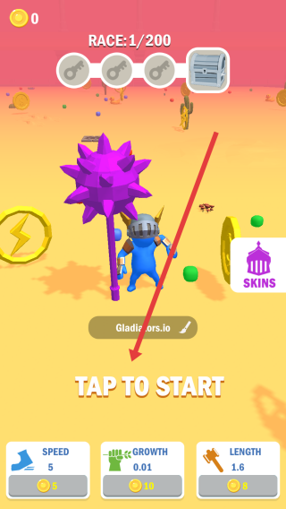 1、点击【TAP-TO-START】,进入【Gladiators.io】,操控角斗士(带紫色武器角色),开启沙漠竞技对战。