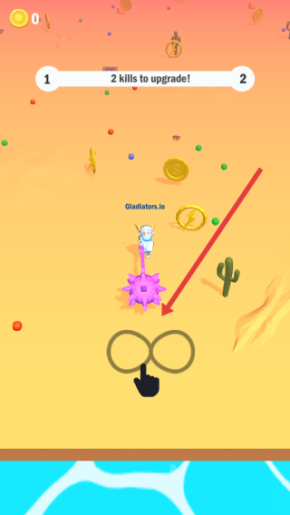 2、战斗中,拖动屏幕箭头指向的符号轨迹(移动指令),控制角斗士移动、攻击,积累击杀数升级。