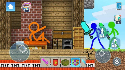 1、基础玩法是通过操控火柴人使用武器击败敌人,同时破坏环境中的方块获取资源,简单直接的战斗机制带来爽快感。