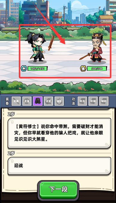 2、随剧情到2岁阶段,遇黄符修士选择迎战,与持剑NPC展开激烈的战斗。