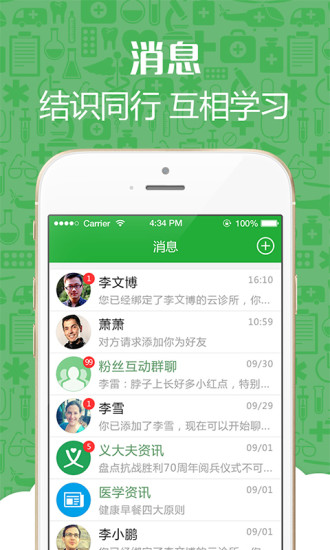 新增消息推送和群聊功能,医生可在自己专属群与关注自己的用户互动,及时收发消息;
