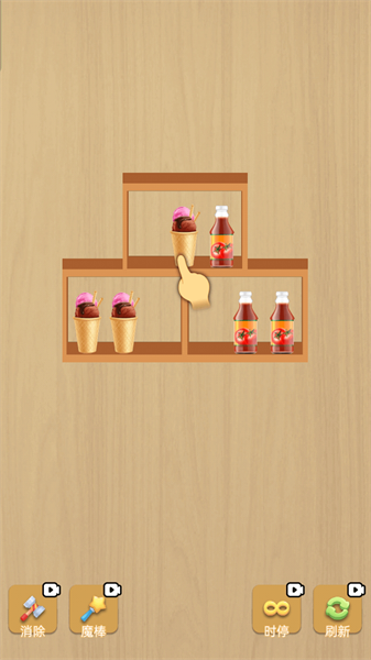 2、当同一货柜堆叠三个相同甜品时自动消除,释放空间并获取积分,利用消除机制优化货架收纳效率。