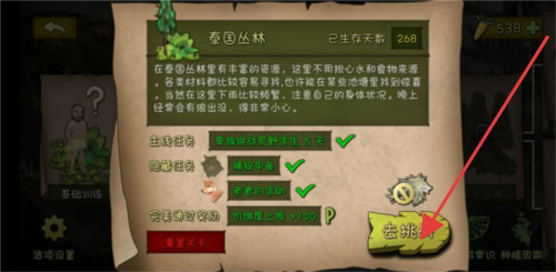 2、在“泰国丛林”,主线任务完成就点“去挑战”开新区域,注意生存天数(268天),保持健康值,晚上别乱跑,缺资源就挖附近植物。
