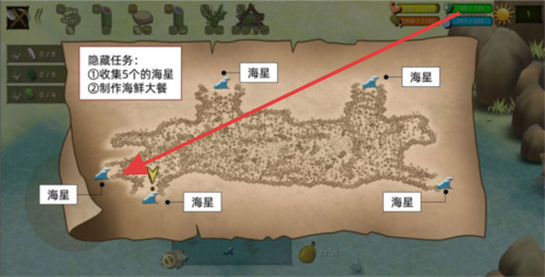 3、做隐藏任务“海鲜大餐”,按地图标红找海星点,挨个收集5个,凑齐后回营地,用烹饪台合成大餐,完成任务拿奖励,解锁新玩法。