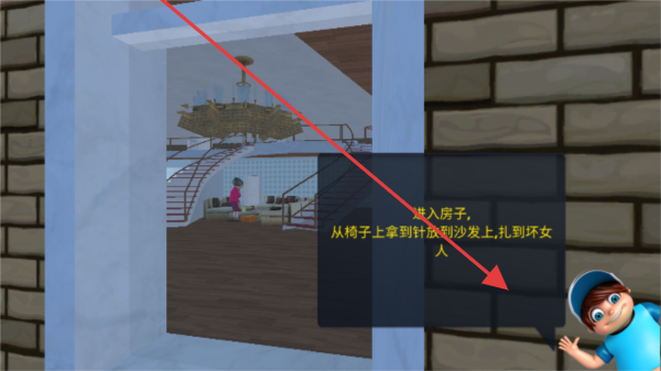 2、做任务看提示!“拿针放沙发扎女人”,先进屋找椅子,快速摸针放沙发,动作要轻,别被发现,触发整蛊后,准备好跑路。