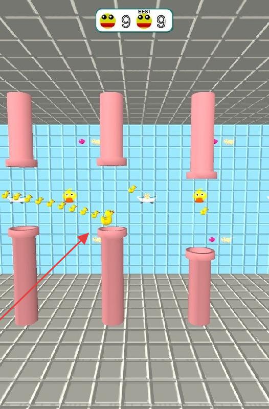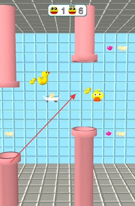 2、游戏场景,小黄鸭需躲避粉色管道,收集黄色小鸭等道具,按箭头指引飞行,挑战高分。