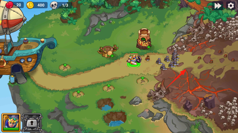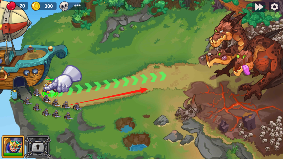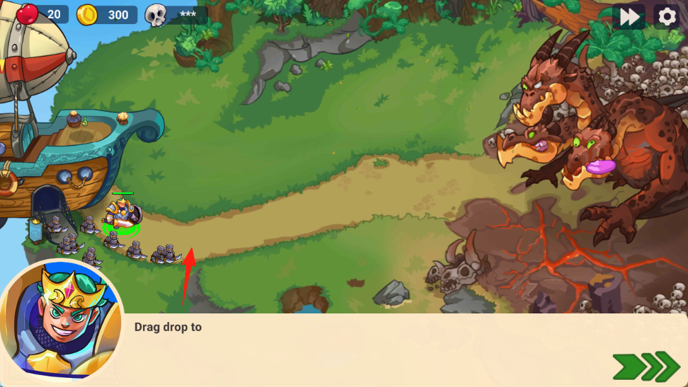 1、英雄部署拖动英雄(左下角王冠角色)到路径,布置防线,拦截三头龙等怪物。