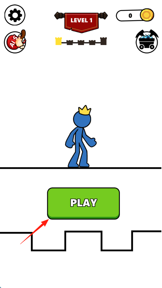 1、关卡启动在“LEVEL1”界面,点击“PLAY”,操控蓝色火柴人国王,进入城堡战场。