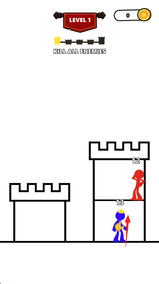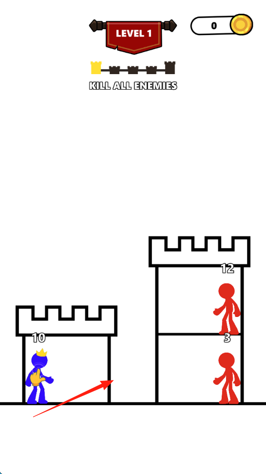 2、敌人歼灭目标“KILLALLENEMIES”,指挥国王攻破红色火柴人城堡,消灭楼层敌人(12、3)。