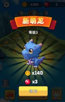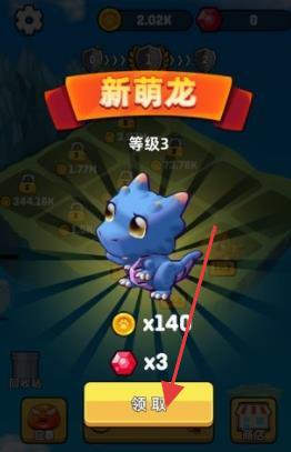 1、在萌龙获取界面,点击“领取”按钮,获得新萌龙(等级3)及奖励(金币×140、钻石×3)。