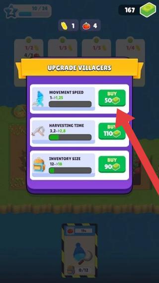 3、呈现“UPGRADEVILLAGERS(升级村民)”界面,可提升村民移动速度、收割时间、库存大小等属性,玩家通过升级优化村民能力推进小镇建设。