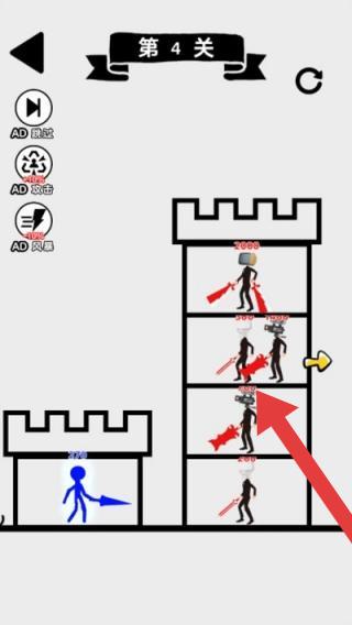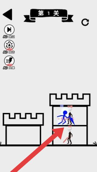 1、从“第1关”“AD跳过”等界面元素,结合火柴人战斗场景(城堡、角色对战)来看,属于火柴人系列,玩家需通过策略操作。