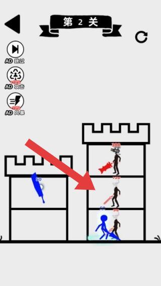 2、从“第2关”等标识及火柴人战斗场景(城堡、红蓝阵营对战)判断,属于火柴人系列,玩家需通过合理操作(如规划攻击路径、释放技能等)。