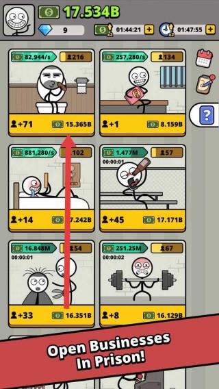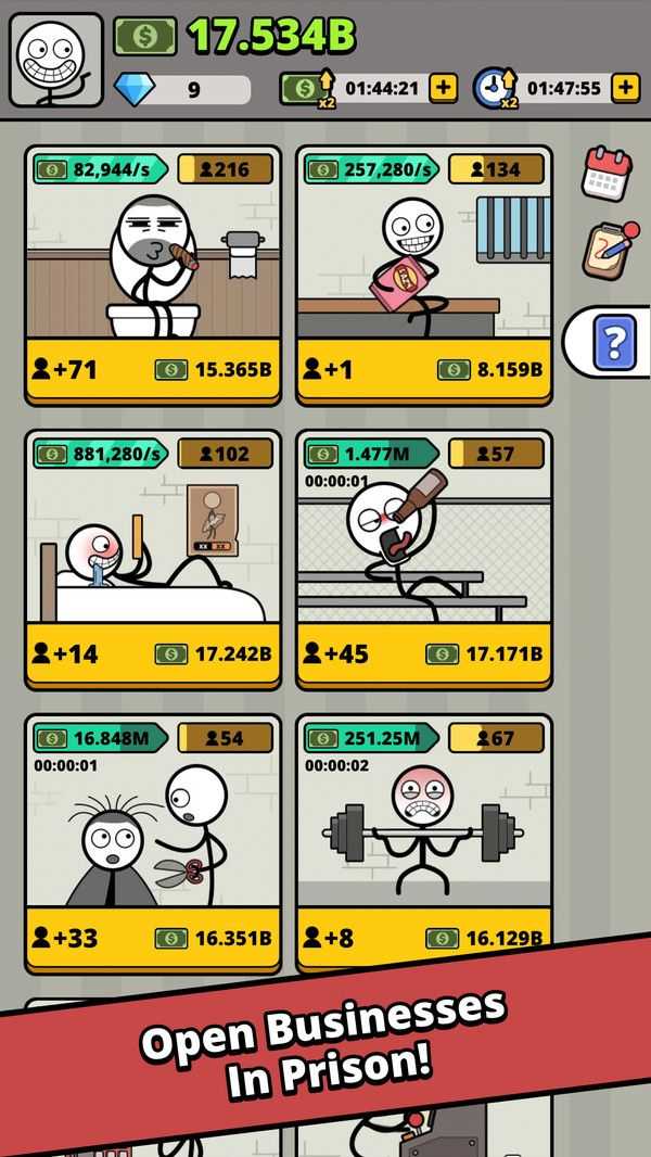 火柴人监狱大亨是一款魔性十足的火柴人系列冒险手游,以搞怪画风与创意玩法吸引玩家,玩家将在监狱中开启逆袭之路,通过开展各类业务赚取收益,从售卖零食到贿赂狱警,一步步成为监狱里的商业大亨,让玩家在幽默剧情中体验别样的监狱经营乐趣。